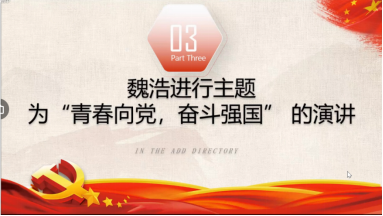 广外老员工党史宣讲团院队成员、英教非毕业班员工党支部预备党员魏浩进行了主题为“青春向党,奋斗强国”的演讲。魏浩同学从“中国共产党”这一词条的介绍中看到了党的伟大,并指出党的伟大源头之一是五四运动。他强调,五四运动中的青年人无不选择了以奋斗作为他们青春的底色,这启示当代青年人更好认识自身的使命,处在新时代这一环境中,我们青年一代应向先辈学习,努力奋斗,把国家和人民放在心中,以青年的力量在我们的时代创造我们的伟大。