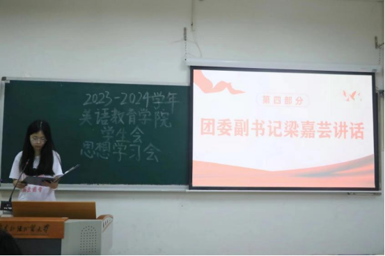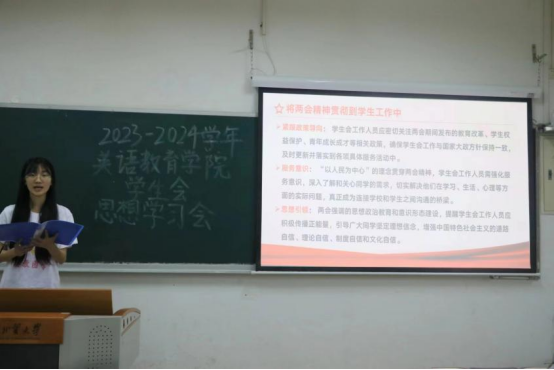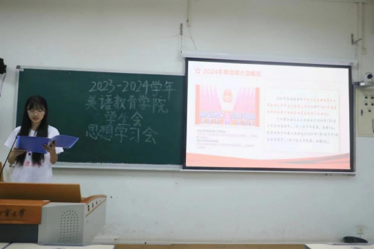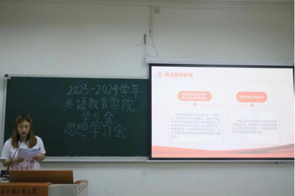 晚上八点整,主持人何川熙介绍本次思想学习会的各项议程,并宣布2023-2024学年太阳城集团员工会思想学习会正式开始。她向各位工作人员介绍了2024年全国两会及其概况并通过两个视频生动形象地带领各位工作人员学习了2024两会工作报告以及两会涉及的关键词。